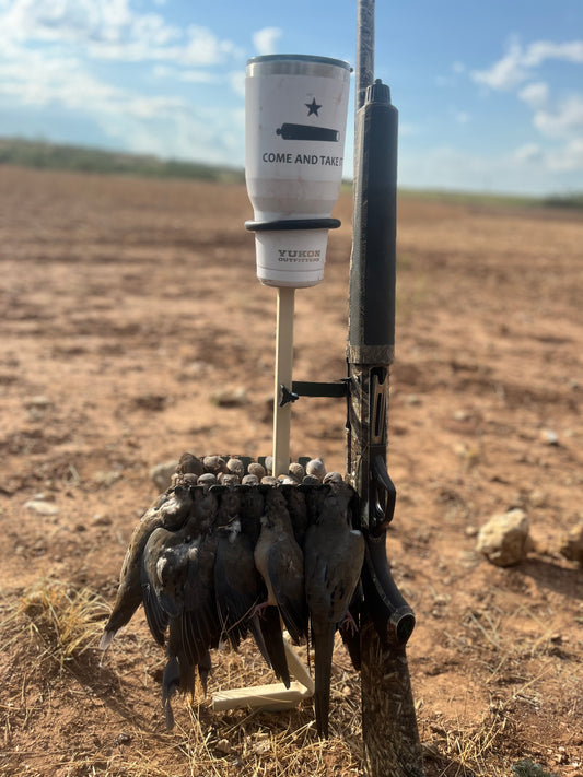 The Dove Caddy is a stand that holds a daily limit of dove (15) has a barrel rest for a safe place to rest a shotgun, and an adjustable cup holder that fits most beverages, bottles, or cups. The foldable design makes for easy transport.